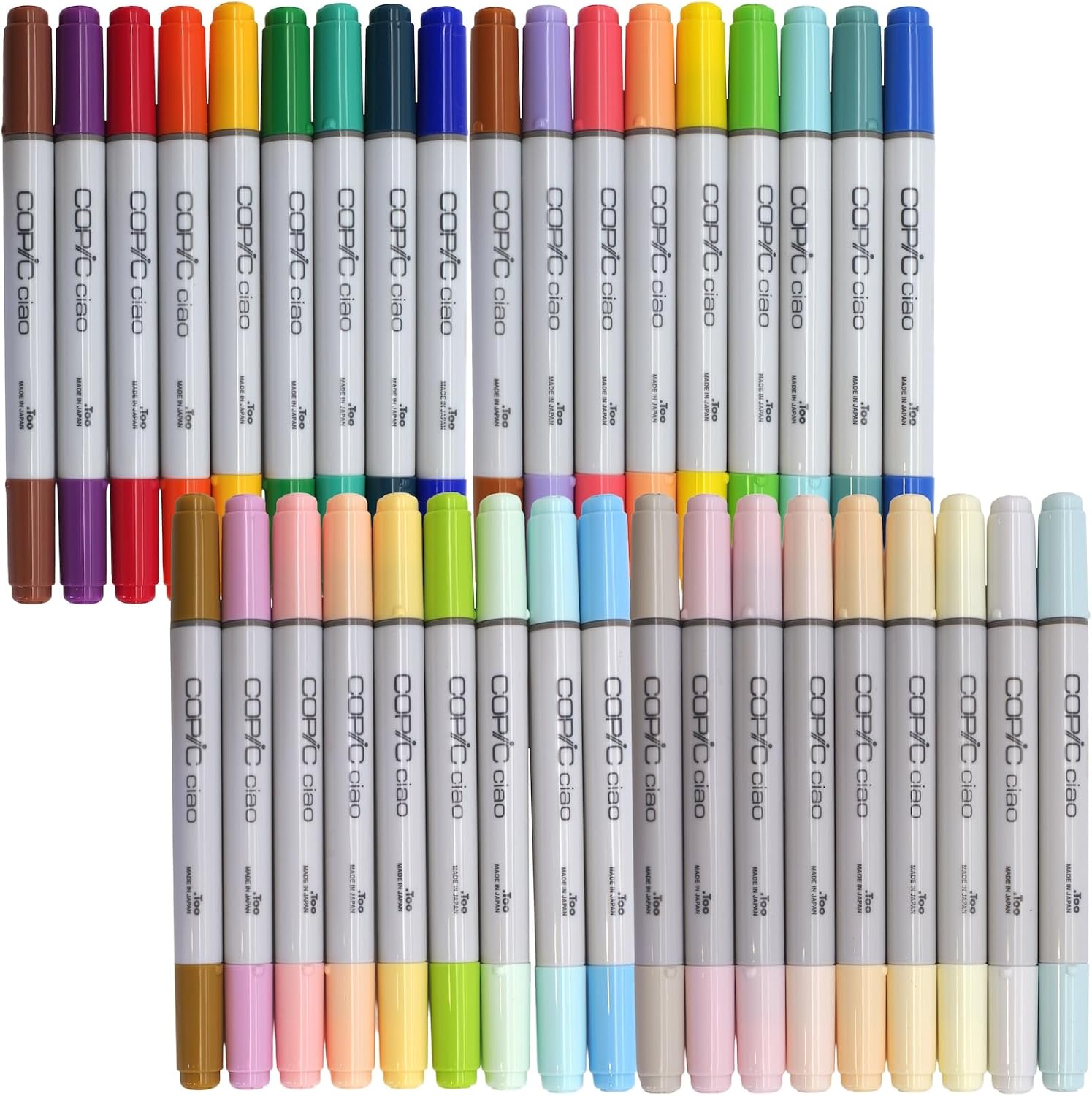 Includes a balanced mix of soft pastels and vivid colours unique to Copic.This set contains lighter, more delicate shades as well as bolder, more intense colours than those found in the Copic Ciao Start 12, 24, and 36-colour sets.Use it together with your existing sets to unlock an even wider range of expression.