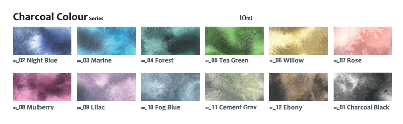 The Charcoal Series uses pigments upcycled from high-quality charcoal offcuts produced by Iken, a renowned Japanese charcoal manufacturer. These paints are characterised by their calm, subdued tones and the subtle, visible grain of charcoal particles.