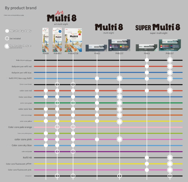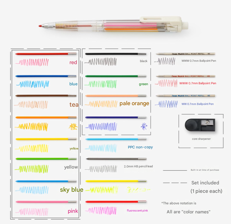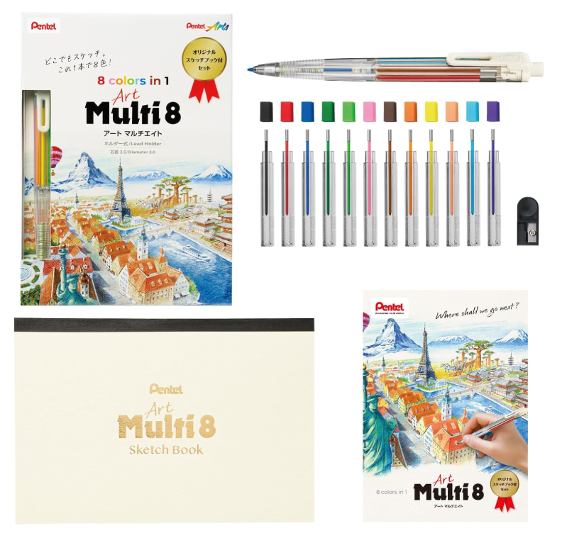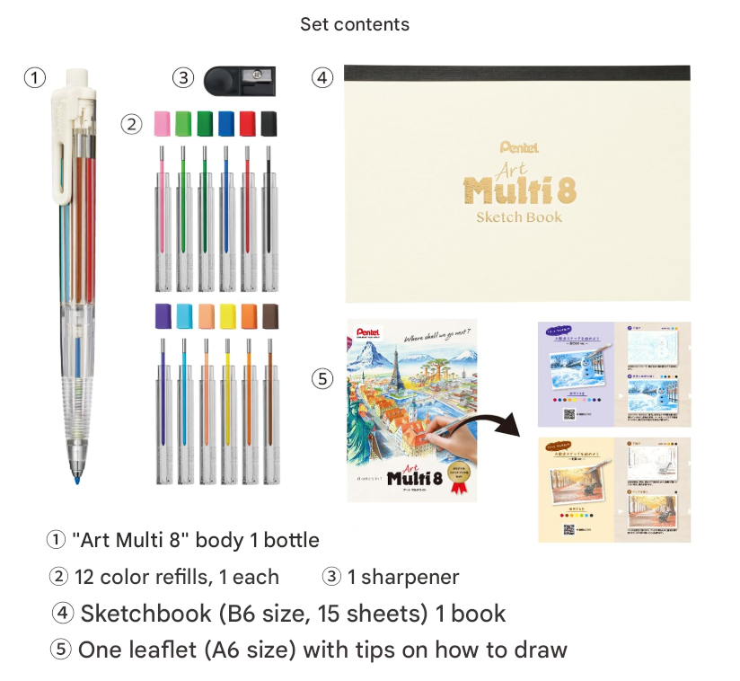 [Features] Sketch anywhere. 8 colors in one pen! [Set Contents] 1: Art Multi 8 pen x 1 / 2: Replacement leads (12 colors, 1 of each) / 3: Sharpener x 1 / 4: Original sketchbook x 1 / 5: Mini leaflet x 1