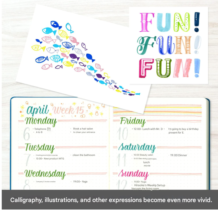 [Features] A color pen that allows you to enjoy a brush-like touch with its flexible pen tip[Colors] 24 colors[Ink] Water-based dye[Size per pen] 18 x 13 x 133mm / 9g[Materials] Cap/Barrel = Recycled PP, End Plug = PE, Pen Tip = Polyester/POM, Inner Cotton = Acrylic Fiber, Tip Metal = Brass