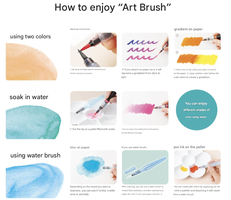 [Features] A brush pen that allows for a variety of expressions, such as creating gradients using two colors or creating shades by dipping it in water.