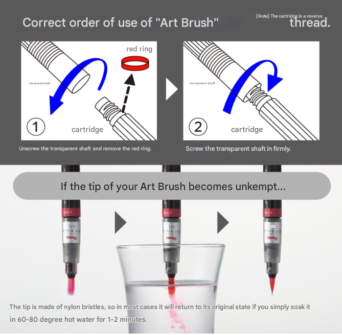 The Art Brush has exceptional tip durability. Even after using up one pen, the tip can still be used. In that case, replacing the cartridge (rear barrel) is economical. It is recommended to prepare cartridges along with your favorite colors.