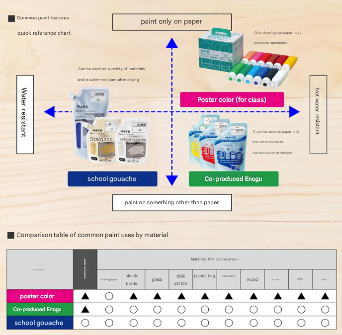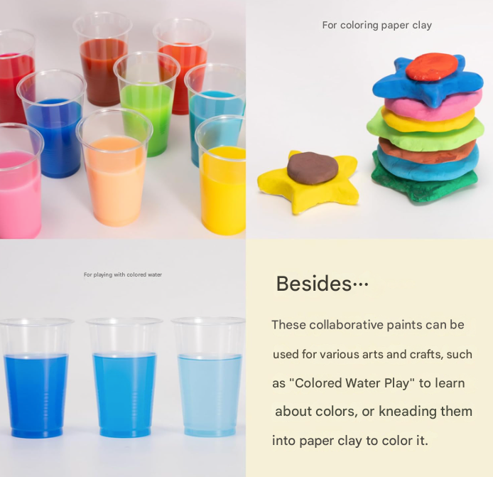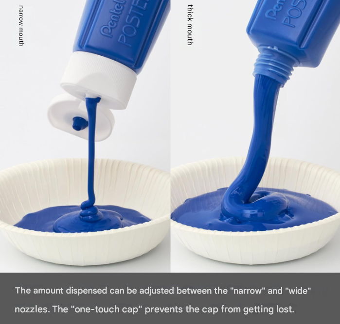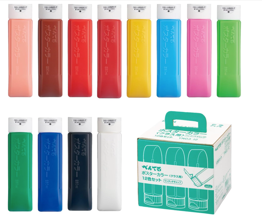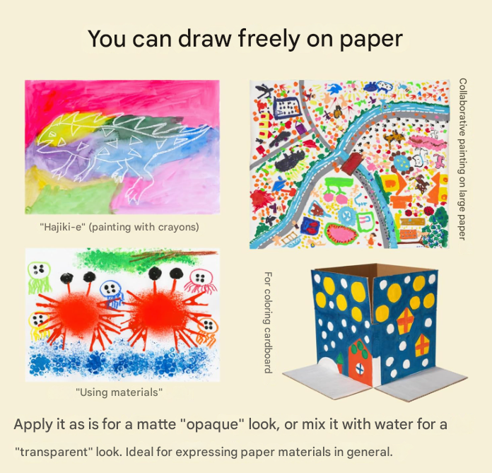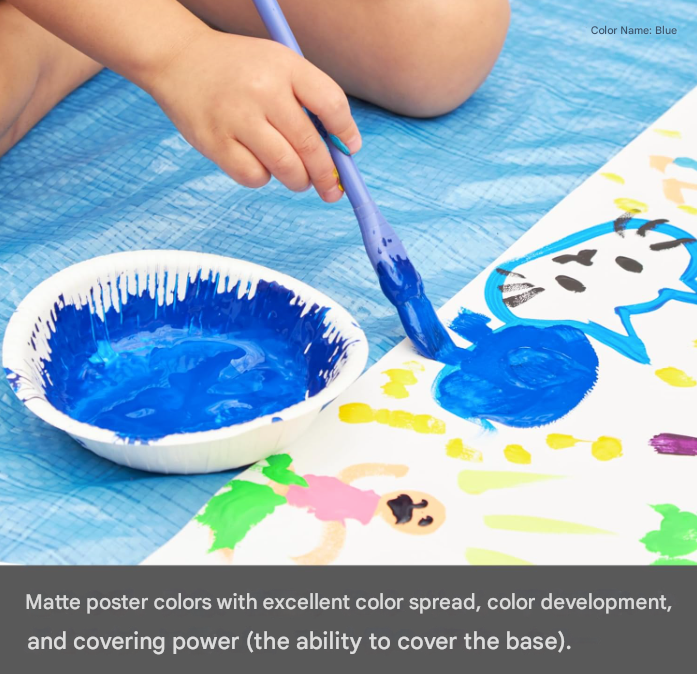 Easy-to-use, wide tubesThese poly tubes are designed to be easy for children's small hands to hold and soft enough to squeeze out the paint. The rounded corners ensure safety and prevent children from cutting their hands or catching on their clothes.Neat storage in a box with a handleThe 12 colors can be stored together in a box with a handle, making it easy to carry and share with several people! The illustrations of the paints on the tubes allow you to see the contents without opening them, and the more you use them, the more convenient they become.The one-touch cap makes it easy to adjust the amount and prevents the cap from getting lost. These 230ml wide tubes are perfect for group projects. Can be used in both opaque and transparent finishes.