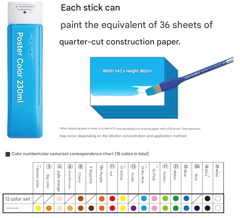 Number of Colors in Set: 12Capacity: 230 ml/bottlePaint Ingredients: Poster ColorSize/Weight: 205 x 147 x 185 mm/4,890 gMaterials: (Cap) Recycled PP, (Tube) Recycled PE, (Color Label/Box) Paper, (Paint) Pigment, Extender Pigment, Water-soluble Adhesive, Stabilizer, Water