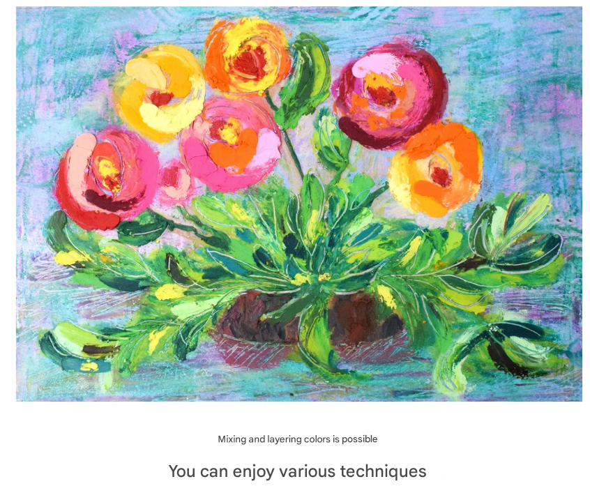 [Feature 2] Highly safe and smooth, it applies easily even to children with weaker hands, allowing for free-flowing drawing. The vibrant colors, along with the ability to blend and layer colors, offer a wide range of expression and are ideal for professional drawing.