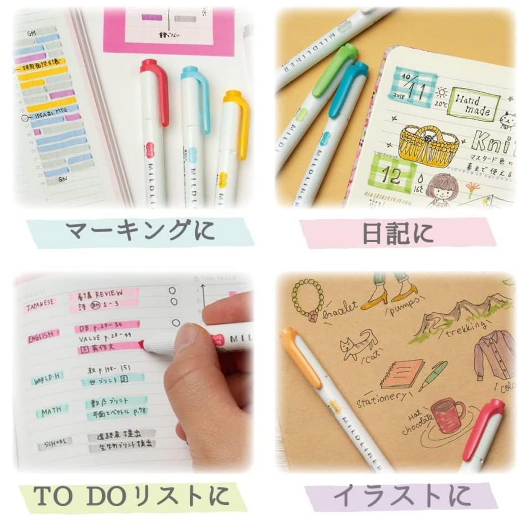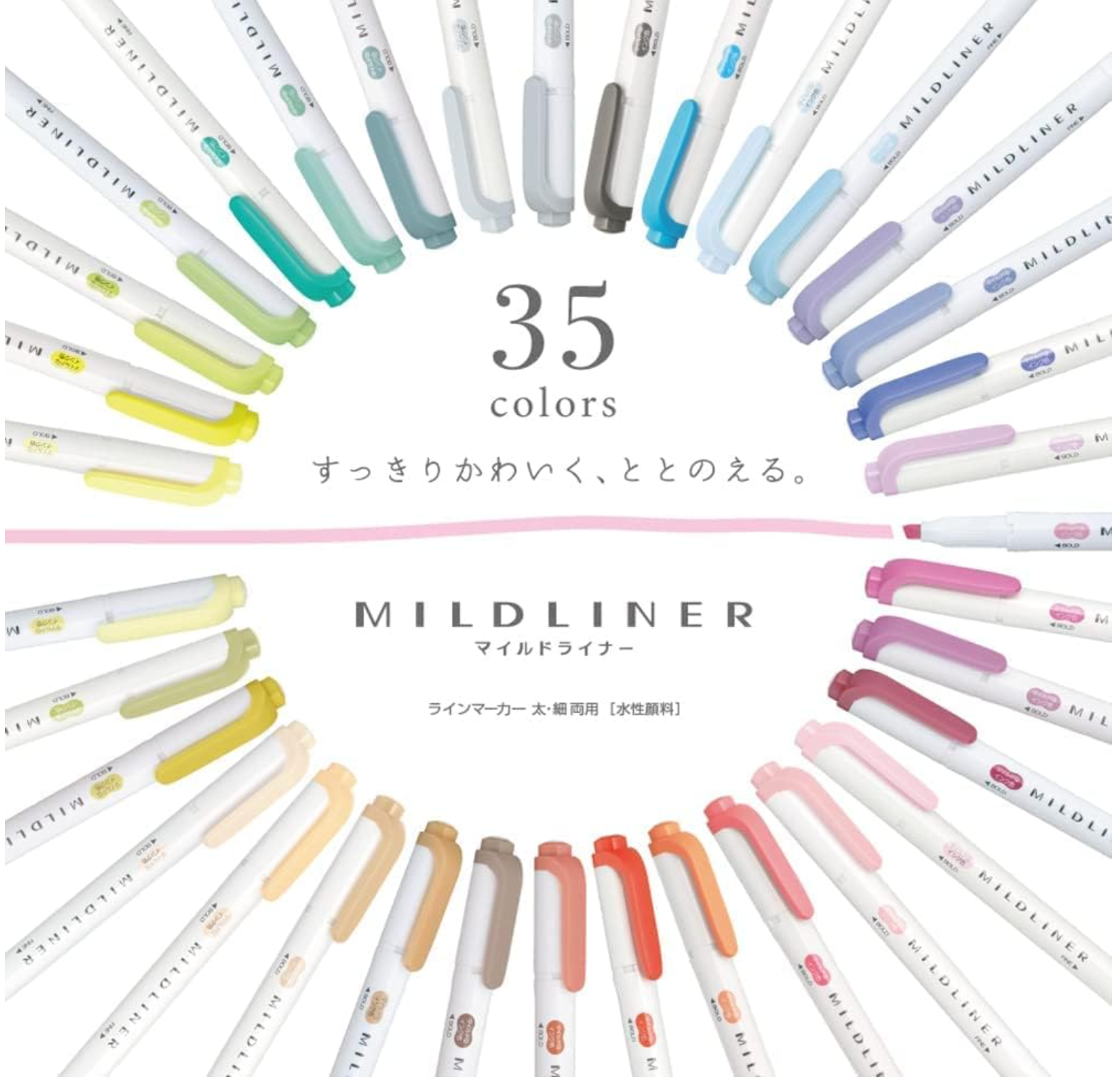 We've got all the colors of Zebra's Mildliner!We have a wide selection of 35 colors! This popular product features pale ink that's easy on the eyes!The gentle colors give your notebook or planner a clean, cute look.The wide range of colors expands the range of uses for illustrations.These easy-to-read, pale highlighters are popular with female students who love cute things and working men who want to write down the information in their planners clearly when reviewing it.The pen body color is white, which is rare for a highlighter. Like the pale ink, the pen body is a subdued color.The subdued logo gives it a refined feel, and the pen body color design makes it easy to find in your pencil case or bag.