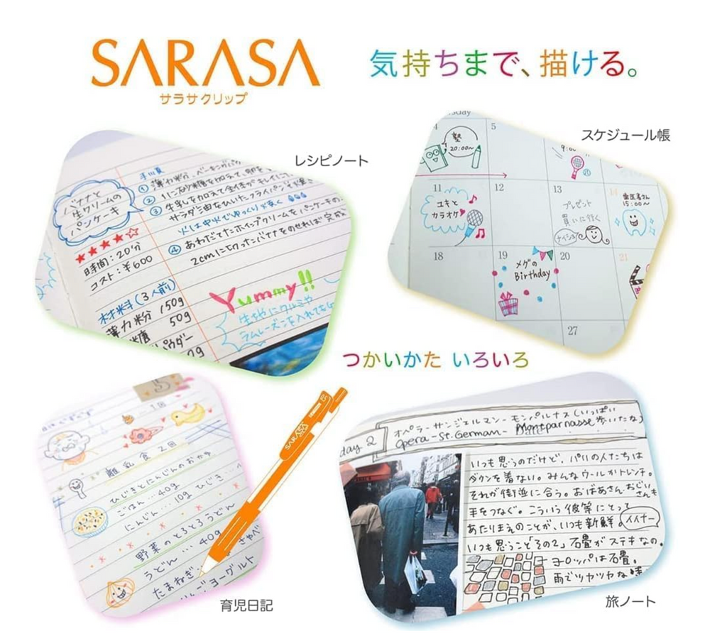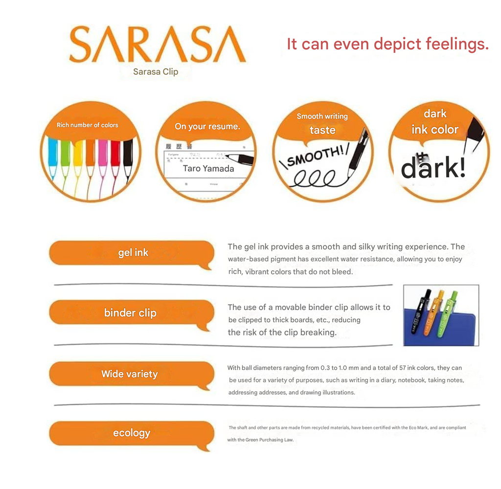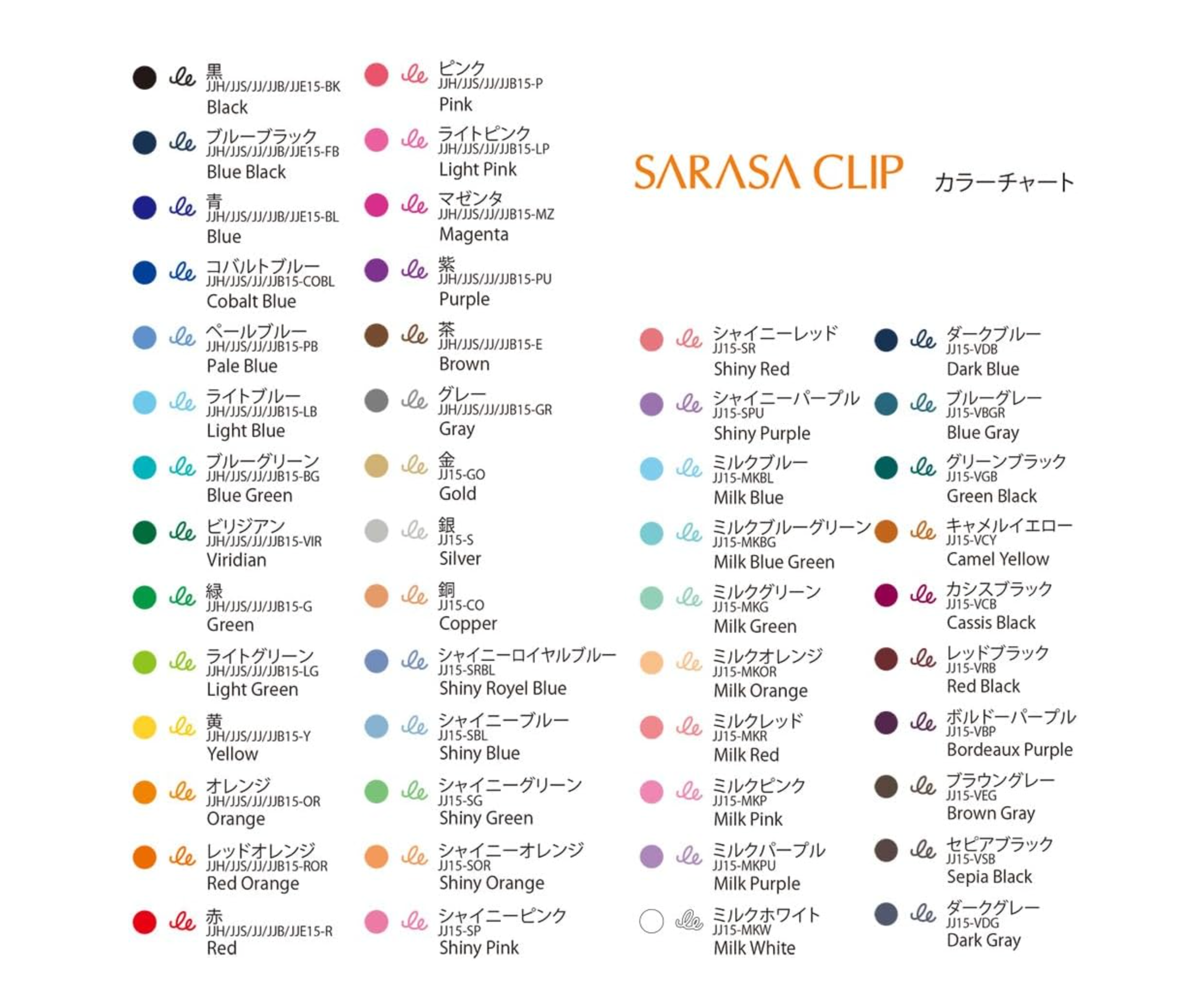 Zebra's incredibly popular Sarasa Clip pen!Thanks to its gel ink, it provides a smooth and effortless writing experience.The water-resistant pigment-based ink is rich and doesn't smudge, offering vibrant colors and a wide variety of shades to choose from.[Binder Clip]The movable binder clip allows you to attach it to thick boards and other materials, reducing the risk of the clip breaking.[Wide Variety]With ballpoint sizes ranging from 0.3mm to 1.0mm and a total of 48 ink colors available, it can be used for various purposes such as writing in diaries and notebooks, taking notes, addressing envelopes, and drawing illustrations.