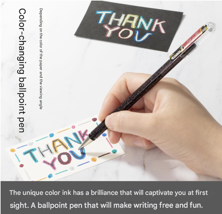 Featuring ink containing glitter pigments that change color depending on the viewing angle, and appear differently on black hair and white paper.