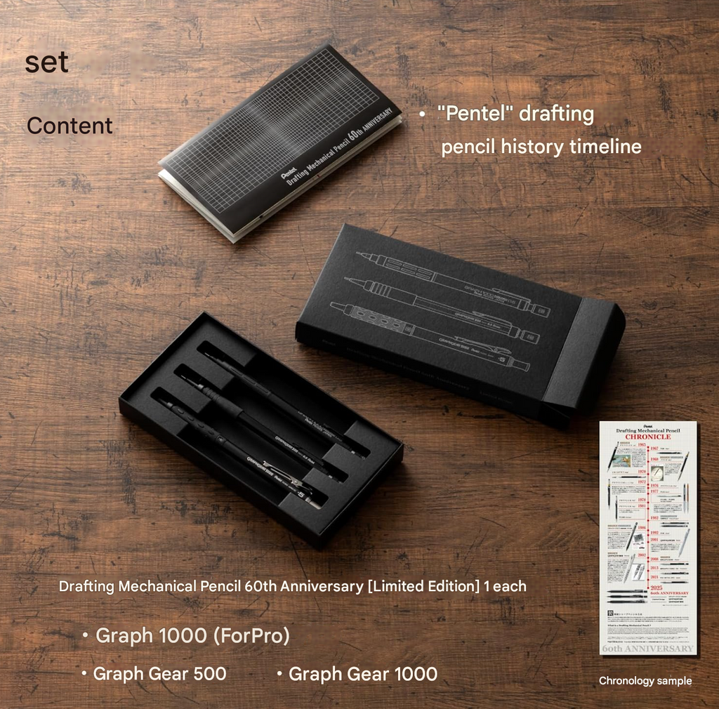 Also included is a timeline summarizing the 60-year history of drafting mechanical pencils.